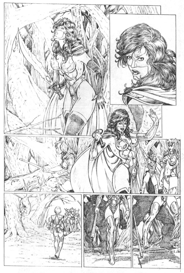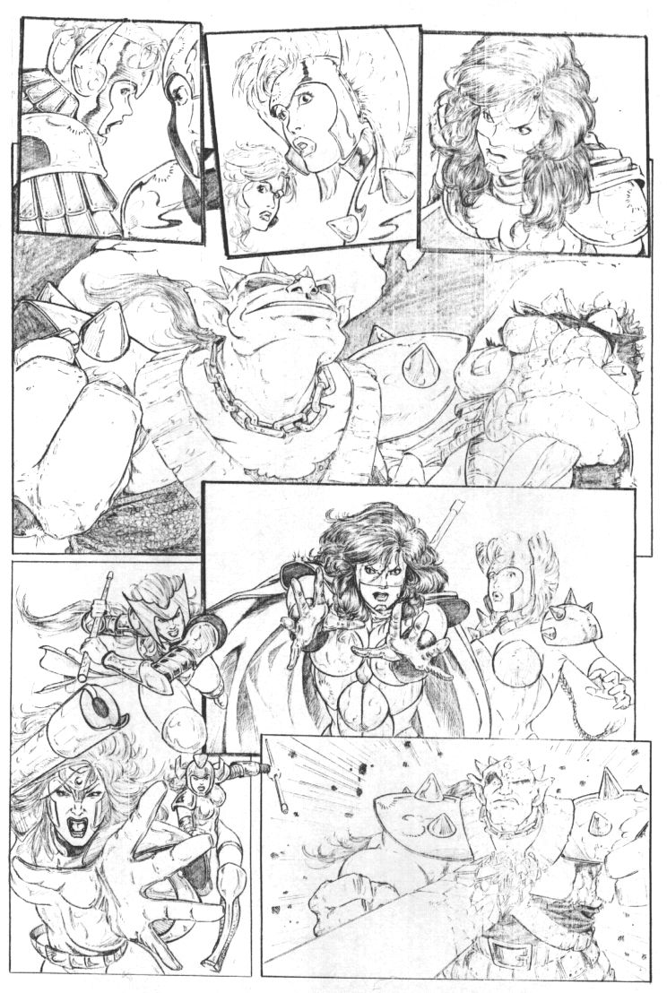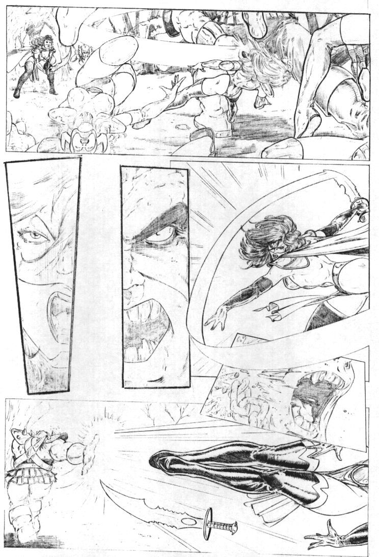 Original Artwork for Mantra #11 Mantra uncensored! This is the original artwork for page 1 of Mantra #11, after Boneyard's wives have stolen our heroine's costume. In the final version in the comic (click bottom image for comparison), Mantra creates a "mystic smoke" to help preserve her modesty, which was obviously added using the digital coloring process later on. However, it appears that the decision to add this "smoke" wasn't part of the original layout. The last two captions on the page (where Mantra talks about how she created the smoke) were apparently added after the fact; the first box covers up the original caption, which reads: