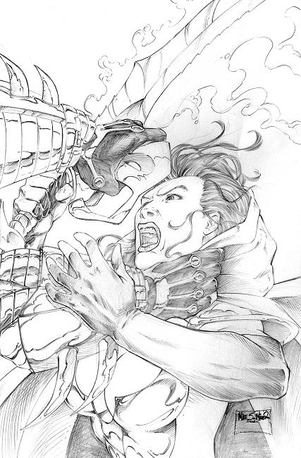 A great black and white sketch (presumably to have been used for cover art) of Mantra having her mask removed by Boneyard. |