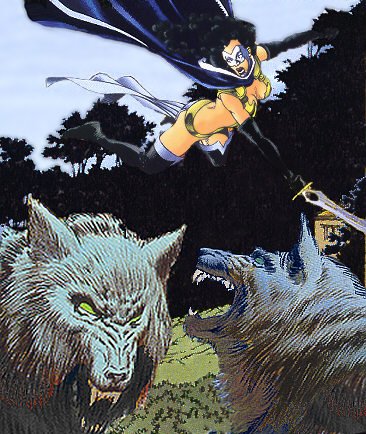 With me thus occupied, the first wolf had time to recover. By raising my shield, I stopped its blindsiding attack, but it immediately started to circumnavigate me and make for the cowering mother and child. I seized the gold ring at my loins and willed it into its natural shape -- if anything as unusual and extraordinary as the Sword of Fangs can ever be called "natural."